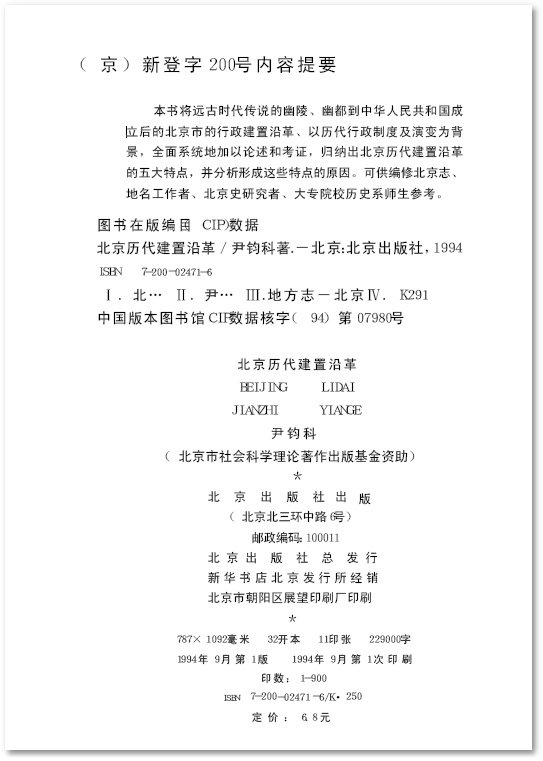 我国历史悠久。在过去两千余年的时间里,封建王朝更替无间,历代疆域时有消长,行政区划每多变迁。再加上古今地名更易,城关都邑兴衰,河湖水系演变,交通路线增辟等等,构成了极为复杂的沿革地理课题。尽管有关的文献记载很多,但有的亡佚失传,有的失之简略,有的是非混淆,有的转抄讹误,从而为研究沿革地理增加了困难。北京地区的情况也是如此。在研究编制《北京历史地图集》的过程中,就遇到过许多疑难问题,长期争论不休,最后只能择其一说落实在图上。在这里还应当指出,采用断限的方法表示某一时期的行政建置和区划,难以反映行政建置和区划演变的具体过程与细节,更无法阐述这种变化的原因。这是历史地图集不可避免的缺陷。而尹钧科的《北京历代建置沿革》一书,采用文字论述的方法,着重于对北京沿革地理上一些疑难问题进行考证和探讨,提出了一些有根有据、能够自圆其说的新观点。这在一定程度上弥补了《北京历史地图集》的不足,可以作为阅读和使用《北京历史地图集》时辅助性参考读物。从这个角度上说,这部书的学术价值和应用价值是显而易见的。