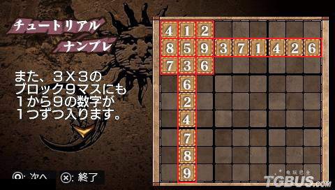 由日本SUCCESS公司发表,BLACK JACK开发的这款PSP益智游戏:《数字游戏10000问》(Numpla 10000-Mon)目前预定2008年4月10日发售,售价仅为2,940日元(含税),可以说是非常超值。本作曾在2007年3月8日推出过NDS版,这次推出的PSP版,将把号称拥有10000个数字谜题带给各位PSP玩家,试问这次PSP版你又要花多长时间才能通关呢? 游戏收录了受到全世界欢迎的逻辑谜题“数独”10000问!这是款能让初学者到高手都可以接受并从中获得乐趣的益智游戏!“数独”(SUDUKU)这一词来自于日语,意思是“单独的数字”或“只出现一次的数字”。概括来说,它就是一种填数字游戏。本作为玩家准备了五个难易程度,玩家可以根据自己的水平进行选择。游戏的规则也十分简单,在推敲之中完全不必用到数学计算,只需运用逻辑推理能力,所以无论老少中青男女 ,人人都可以玩。而且容易入手、容易入迷,一玩就上瘾。只需将九个大方块中的九个小方块中填入从数字1至9的不重复数字即可。这也超越了文字的障碍,因此自从出现后,从东方到西方,风靡亿万人。