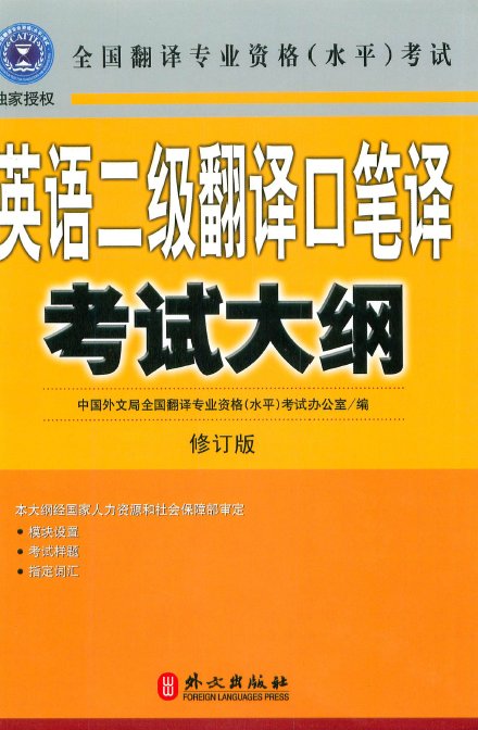 《英语二级翻译口笔译考试大纲》(修订版)根据中华人民共和国人事部发布的《翻译专业资格(水平)考试暂行规定》和《二级、三级翻译专业资格(水平)考试实施办法》,中国外文局组织全国翻译专业资格(水平)考试专家委员会专家编写了《英语二级翻译口笔译考试大纲》,并经人事部组织有关专家审定通过。《英语二级翻译口笔译考试大纲》(修订版)是英语二级翻译专业资格(水平)考试的指导性文件,是考试命题的依据,也是应考人员的重要参考指南。根据翻译专业人员实际工作所需要的知识和能力,明确了考试的范围、内容、重点,对考核点分层次提出了要求。要求“掌握”的是重点内容,要求“熟悉”的是重要内容,要求“了解”的是相关内容,应考人员应全面学习和了解,争取成为合格的翻译人员。