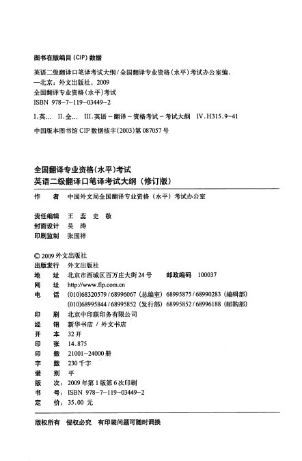 中文名: 人事部翻译考试-2009-2010.7版英语二级翻译口笔译考试大纲及指定教材(全国翻译专业资格水平考试辅导丛书)》