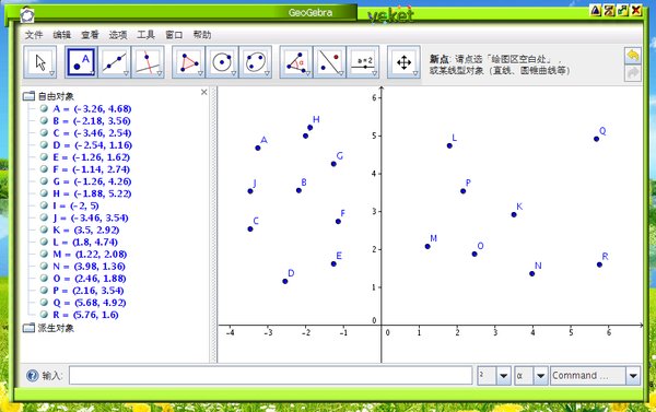 可以借助工具栏中所提供的作图工具,在几何区中使用鼠标进行几何作图。从工具栏中选择其中一种作图工具,可借助工具使用提示(在工具栏后方)来得知如何使用所选择的工具。任何在几何区中所产生的对象,在代数区中都有一个代数特征。