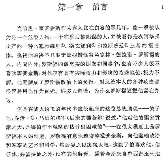 : 第一部 1941年以前-霍普金斯所受教育与培养 第一章前言 第二章从苏城到华盛顿 第三章救济计划 第四章总统欲 第五章虚张声势的战争 第六章前海军人员 第七章连锁反应 第八章竞选第三任总统 第九章白宫 第二部 1941年-并非空言搪塞 第十章花园浇水管 第十一章唐宁街十号 第十二章非正式联盟 第十三章无限制的紧急状态 第十四章向东推进 第十五章克里姆林宫 第十六章大西洋会议 第十七章一发现就开火 第十八章援助俄国 第十九章太平洋上的战争 第三部 1942年-回旋乏地 第二十章阿卡迪亚会议 第二十一章对维希的政策 第二十二章灾难之冬 第二十三章进攻的决定 第二十四章莫洛托夫来访 第二十五章决定改变了 第二十六章转折点 第四部 1943年-第二战场 第二十七章卡萨布兰卡会议 第二十八章政治成分 第二十九章“三叉戟”和“四分仪” 第三十章开罗、德黑兰和“霸王”行动 第三十一章第四任 第三十二章分歧的开始 第三十三章雅尔塔会议 第三十四章头痛得要命 第三十五章最后的使命 第三十六章结论