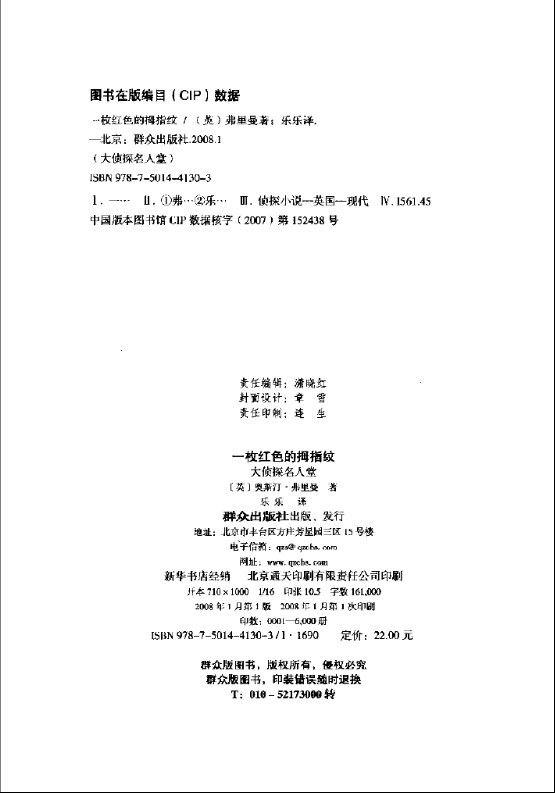 本书是英国著名侦探小说家,“本格派”作家中最本格的推理小说大家——奥斯汀·弗里曼的代表作,被美国侦探小说家协会及世界推理迷列为百部必读经典之一。 保险箱里,一小袋钻石不翼而飞,只留下一个血红色的拇指印。警方按图索骥,以为找到指纹的主人,就找到了罪犯。如此一来,一名文质彬彬的年轻人受到了无情指控……