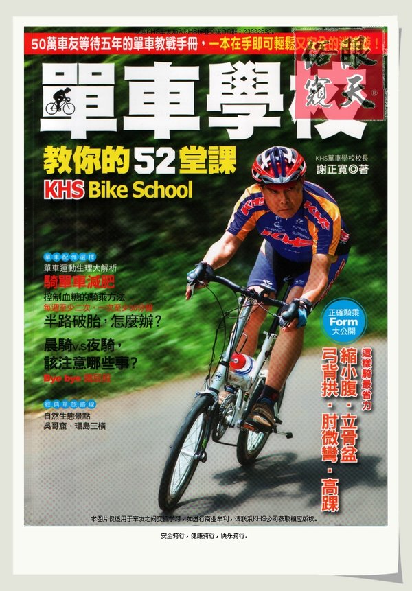 《单车学校教你52堂课》是KHS自行车董座及单车学校校长谢正宽力时五年才完成的著作。书中针对骑单车的正确姿式,包括如何缩小腹、立骨盆;上路之前该如何调整座垫的位置,用什么方式骑才不会铁屁股?万一摔车,该怎么应对?骑车的时候,该怎么呼吸?……,不仅釐清一般人错误的骑车观念,更要告诉你如何有效骑乘,可以花最少的力气,骑最远的距离。透过谢校长精采且专业的文字内容,搭配清楚易懂的图表与照片解说,让你成为聪明的自行车专家!