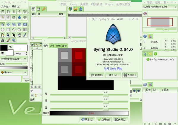 Synfig 是个强大,工业级别的矢量2D动画软件包,其设计的初衷,是为了只用少量的人力和物力来生产故事片级别质量的动画。 "市面上有众多其他的程序在做推进 2D 动画生产效率的事情,但是,直到现在,我们也没发现有哪个软件可以和我们的媲美。"此为内部描述。