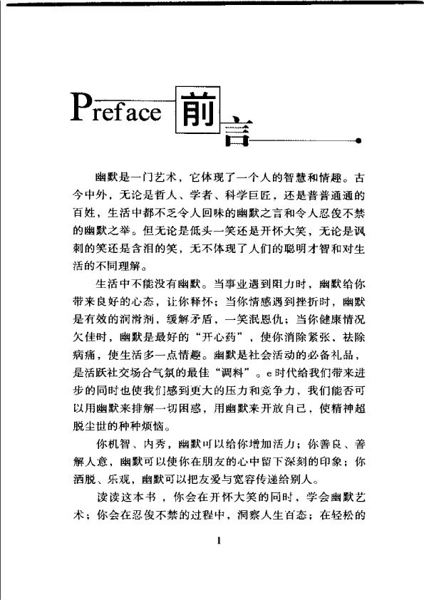 幽默是一门艺术,它体现了一个人的智慧和情趣。古今中外,无论是哲人、学者、科学巨匠,还是普普通通的百姓,生活中都不乏令人回味的幽默之言和令人忍俊不禁的幽默之举。但无论是低头一笑还是开怀大笑,无论是讽刺的笑还是含泪的笑,无不体现了人们的聪明才智对生活的不同理解。 开心的人就是把小小的快乐放到无限大! “一滴墨水引发你的思考,一本好书改变了人的一生。”在我们成长的岁月中确实需要这么一本书。