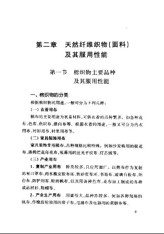 : 第一章 纺织品的分类 第一节 纤维的分类 第二节 纱线的分类 第三节 织物的分类 第二章 天然纤维织物及其服用性能 第一节 棉织物主要品种及其服用性能 一 棉织物的分类 二 棉织物的规格 三 棉平纹织物的主要品种及其服用性能 四 棉斜纹织物的主要品种及其服用性能 五 棉缎纹织物的主要品种及其服用性能 六 彩色棉织物及其服用性能 七 其他棉织物及其服用性能 第二节 麻织物主要品种及其服用性能 一 苎麻织物的主要品种及其服用性能 二 苎麻织物的发展趋势和服用性能的改善 三 亚麻织物及其服用性能 四 大麻织物及其服用性能 五 罗布麻织物及其服用性能 六 其他麻织物及其服用性能 第三节 丝织物的分类 一 丝织物的分类 二 丝织物主要品种及其服用性能 第四节 毛织物主要品种及其服用性能 一 毛织物的分类 二 精梳毛织物主要品种及其服用性能 三 粗梳毛织物主要品种及其服用性能 四 精梳、粗梳毛织物统一编号 五 羊绒织物及其服用性能 六 彩色羊毛和彩色兔毛等产品及其服用性能 第三章 化学纤维织物及其服用性能 第一节 再生纤维织物及其服用性能 一 粘胶纤维织物及其服用性能 二 Lyocell纤维织物及其服用性能 三 莫代尔纤维织物及其服用性能 四 聚乳酸纤维织物及其服用性能 五 甲壳质和壳聚糖纤维织物及其服用性能 六 大豆纤维织物及其服用性能 第四章 常见色织物品种及其服用性能 第五章 多功能、高功能织物 第六章 皮革、毛皮和羽绒制品及其服用性能 第七章 常见针织物及其服用性能 第八章 纤维性能、纱线和织物结构对纺织品服用性能的影响 第九章 织物的起球和磨损 第十章 纺织品的阻燃性 第十一章 纺织品的抗静电性 第十二章 织物的光泽 第十三章 织物的舒适性 第十四章 织物的风格 第十五章 服装的卫生学 第十六章 织物服用性能的设计原理 参考文献