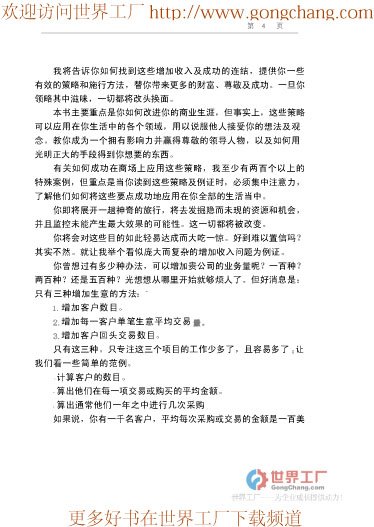 《发现你的销售力量》将告诉你如何找到这些增加收入及成功的秘密,提供你一些有效的策略和执行方法,替你带来更多的财富、尊敬及成功。一旦你领略其中滋味,一切都将改头换面。事实上,这些策略可以应用在你生活中的各个领域,用以说服他人接受你的想法观念,教你成为一个拥有影响力并赢得尊敬的领导人物,以及如何用光明正大的手段得到你想要的东西。你即将进一步趟神奇的旅行,将去发掘隐而未现的资源和机会。