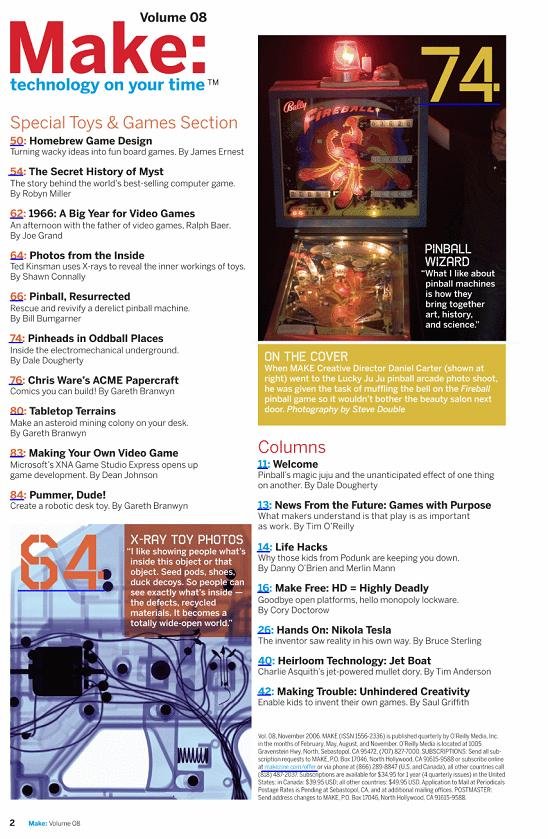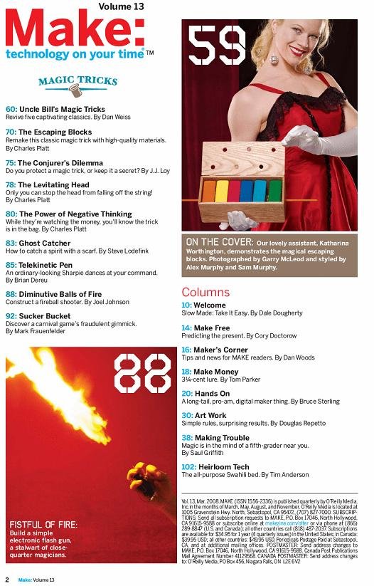 Make杂志是由O'Reilly Media出版的一本季刊,其内容专注于DIY(自己动手做)和/或DIWO(与他人一起做)的项目诸如计算机,电子,机器人,金属制品,木制品和其它学科。该杂志面向那些喜爱“做”东西的人,各种由简单的材料完成的复杂项目是该杂志的特色,甚至包括一些家庭用品。
