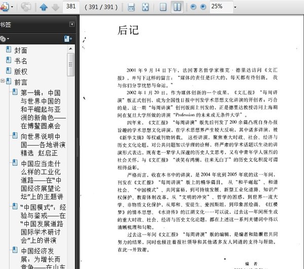 本书中的讲演是来自于2004年底到2005年底的这一年间,刊发在《文汇报》“每周讲演”版上的精华篇目。从“和平崛起”、和谐社会、“中国模式”、共同富裕,到可持续发展、新型工业化道路、知识产权保护、教育体制改革,从“文明的冲突”、哲学的困惑,到世界一流大学、非物质文化保护,从郑和、安徒生、爱因斯坦,到印象派绘画、《红楼梦》的情本思想、《水浒传》的江湖文化……可以说,过去这一年间所生成的重大时政、社会、经济与历史文化论题,都在上述这一系列关键词中得以清晰梳理和勾勒。这里,前沿的思想火花和学术观点的碰撞,严肃的学术品格和生动的阅读形式,让热点话题学术化,学术话题公共化。