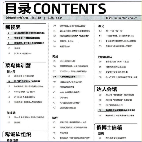 : 《电脑爱好者》杂志社创建于1993年6月,隶属于中国科学院。发展至今,她已经成为拥有《电脑爱好者》半月刊、《电脑高手》、《电脑爱好者合订本》、《互动软件》、《数码》、《电脑爱好者》普及版六本电脑类刊物,集采编、出版、发行、展览、广告、销售于一体的集团化企业。   杂志社的旗舰产品《电脑爱好者》半月刊的月发行量已近80万册,连年稳居“中国电脑刊物发行量第一的”的宝座。10年来,《电脑爱好者》秉承浅显易懂、通俗流畅的风格,面对越来越多的初中级电脑爱好者,传播电脑知识,培养电脑人才,其内容广泛涉猎软件、硬件、市场、评测、网络、游戏、编程等多方面,每年一度的“编辑选择奖”和“电脑爱好者最喜爱品牌” 在业界深具影响力,奖牌和LOGO也被广泛采用。这本“大家都能看懂的”《电脑爱好者》半月刊早已经成为电脑爱好者首选的学习读物。   《电脑爱好者》网站(www.cfan.com.cn)以其实用、信息量大、服务全面受到读者好评,也是电脑爱好者网上交流的场所;《电脑爱好者》读者俱乐部利用成熟的邮购平台,通过与厂商的合作,以设计和组织会员的活动形式,为读者提供立体、全方位地服务项目,从而成为横跨于读者群体与厂商群体间的桥梁。《电脑爱好者》系列精品图书可以满足不同层次、不同需求爱好者的要求。每年一届的“电脑爱好者城”展会拉近了《电脑爱好者》编辑与读者的距离,让大家有见面、交流的机会。   今天,《电脑爱好者》更加崇尚团队精神,追求全面合作,为着共同的理想携手并进。我们恪守“科技为先,以人为本”的经营理念和团结、创新、和谐、奋进的企业文化,朝气蓬勃、奋发进取,在这条充满光辉的道路上不断创新,孜孜以求。 第一期
