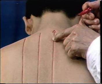 中华人民共和国国家标准 GB 12346-90 经 穴 部 位 Location of Points -------------------------------------------------------------------------------- 本标准中穴位名称的著录方式参照采用世界卫生组织总部针灸穴名国际标准化科学组会议审定通过的《标准针灸穴名》。 1主题内容与适用范围 本标准规定了人体腧穴定位的方法和361个经穴、48个经外穴的标准定位。 本标准适用于针灸教学、科研、医疗、出版及国内外针灸学术交流。 2 关于经穴定位的依据和方法 2.1 经穴定位的依据 根据中医典籍和历代针灸学专著,如《黄帝内经》、《脉经》、《针灸甲乙经》和《铜人腧穴针灸图经》等文献,结合近年我国出版的高等医药院校和国际针灸培训班用的教材和专著,通过分析、讨论,注重临床实际和现代研究成果,对十四经穴及部分经外穴进行标准化定位。 确定经穴标准部位,是以中医学基础理论和经络学说以及审定穴位的准则为指导的。中医学对人体部位与方位的描述与现代解剖学不完全相同。将上肢的掌心一侧即屈侧称为"内侧"是手三阴经穴所分布的部位;将手背一侧即伸侧称为"外侧",是手三阳经穴所分布的部位。将下肢向正中线的一侧称为"内侧",是足三阴经穴分布的部位;将下肢背正中线的一侧称为"外侧",下肢的后部称为"后侧",是足三阳经穴分布的部位。 手足部掌面与背面皮肤的移行处称"赤白肉际";掌指关节或跖趾关节都称"本节",以关节两端的圆形突起(包括关节囊所覆盖处)为准,区分为"本节前"和"本节后"。即以远端为"前",近端为"后"。上肢的前后方位则以拇指侧即桡侧为"前",小指侧即尺侧为"后" 头面躯干部的前后正中线分别为任脉穴和督脉穴的分布部位,是审定分布于其两侧的三阴经穴或三阳经穴的基础。 2.2 经穴定位的方法 经穴定位的方法分三种:a.体表解剖标志定位法;b."骨度"折量定位法;c.指寸定位法,三者在应用时互相结合,即以体表解剖标志为主,折量各部位的距离分寸,并用手指来比量,从而确定经穴位置。分述如下: 2.2.1 体表解剖标志定位法 这是指以体表解剖学的各种体表标志为依据来确定经穴位置的方法。体表解剖标志,可分为固定的标志和活动的标志两种。 固定的标志,指各部由骨节和肌肉所形成的突起或凹陷,五官轮廓,发际,指(趾)甲、乳头、脐窝等。例如,于腓骨头前下方定阳陵泉;三角肌尖端部定臂臑;眉头定攒竹;两眉之中间定印堂;两乳头之中间定膻中等。 活动的标志,指各部的关节、肌肉、肌腱、皮肤随着活动而出现的空隙、凹陷、皱纹、尖端等。例如:听宫,在耳屏与下颌关节之间,微张口呈凹陷处;曲池,在屈肘时,肘横纹外侧端凹陷处。 全身各部的主要体表解剖标志如下: 头部: a.前发际正中(头部有发部位的前缘正中); b.后发际正中(头部有发部位的后缘正中); c.额角(发角)(前发际额部曲角处); d.完骨(颞骨乳突)。 面部: a.眉间(印堂)(两眉头之间的中点处); b.瞳孔(正坐平视,瞳孔中央)或目中(目内眦至外眦连线的中点处)。 颈、项部: a.喉结(喉头凸起处); b.第七颈椎棘突。 胸部: a.胸骨上窝(胸骨切迹上方凹陷处); b.胸剑联合中点(胸骨体和剑突结合部); c.乳头(乳头的中央)。 腹部: a.脐中(神阙)(脐窝的中央); b.耻骨联合上缘(耻骨联合上缘与前正中线的交点处); c.髂前上棘(髂骨嵴前部的上方突起处)。 侧胸、侧腹部: a.腋窝顶点(腋窝正中央最高点); b.第十一肋端(第十一肋骨游离端)。 背、腰、骶部: a.第七颈椎棘突; b.胸椎棘突1~12、腰椎棘突1~5、骶正中嵴、尾骨; c.肩胛冈根部点(肩胛骨内侧缘近脊柱侧点); d.肩峰角(肩峰外侧缘与肩胛内连续处); e.髂后上棘(髂骨嵴后部的上方突起处)。 上肢: a.腋前纹头(腋窝皱襞前端); b.腋后纹头(腋窝皱襞后端); c.肘横纹; d.肘尖(尺骨鹰嘴); e.腕掌、背侧横纹(尺、桡二骨茎突远端连线上的横纹)。 下肢: a.髀枢(股骨大转子); b.股骨内侧髁(内辅上); c.胫骨内侧髁(内辅下); d.臀下横纹(臀与大腿的移行部); e.犊鼻(外膝眼)(髌韧带外侧凹陷处的中央); f.腘横纹(腘窝处横纹); g.内踝尖(内踝向内侧的凸起处); h.外踝尖(外踝向外侧的凸起处)。 2.2.2 "骨度"折量定位法 这是指以体表骨节为主要标志折量全身各部的长度和宽度,定出分寸,用于经穴定位的方法。即以《灵枢·骨度》规定了人体各部的分寸为基础,并结合历代学者创用的折量分寸(将设定的两骨节点之间的长度折量为一定的等分,每一等分为1寸,十等分为1尺),作为定穴的依据。全身主要"骨度"折量寸见下表。 "骨度"折量寸表 部位 起止点 折量寸 度量法 说明 头 面 部 前发际正中—后发际正中 12 直寸 用于确定头部经穴的纵向距离 眉间(印堂)—前发际正中 3 直寸 用于确定前或后发际及其头部经穴的纵向距离 第七颈椎棘突下(大椎)—后发际正中 3 直寸   眉间(印堂)—后发际正中—第七颈椎棘突下(大椎) 18 直寸   前两额发角(头维)之间 9 横寸 用于确定头前部经穴的横向距离 耳后两乳突(完骨)之间 9 横寸 用于确定头后部经穴的横向距离 胸 腹 胁 部 胸骨上窝(天突)—胸剑联合中点(歧骨) 9 直寸 用于确定胸部任脉穴的纵向距离 胸剑联合中点(歧骨)—脐中 8 直寸 用于确定上腹部经穴的纵向距离 脐中—耻骨联合上缘 5 直寸 用于确定下腹部经穴的纵向距离 两乳头之间 8 横寸 用于确定胸腹部经穴的横向距离 腋窝顶点—第11肋游离端(章门) 12 直寸 用于确定胁肋部经穴