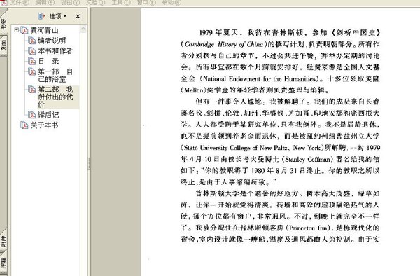 : 第一部 自己的浴室 中国内陆 印度与缅甸 上海 第二部 我所付出的代价 普林斯顿,新泽西 安亚堡,密西根 密西根:更多的回忆 没有特定地点:只不过是历史学家的反省 剑桥,麻省 剑桥,英国 寻找对历史的技术辩证 新港,康涅狄格 纽约,纽约