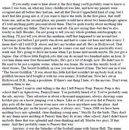 《麦田里的守望者》故事讲述的主人公是16岁的中学生霍尔顿·考尔德是当代美国文学中最早出现的反英雄形象之一,霍尔顿出身中纽约一个富裕的中产阶级家庭。学校里的老师和自己的家长强迫他好好读书,为的是出人头地,以便将来买辆凯迪拉克,而在学校里一天到晚干的,就是谈女人,酒和性,他看不惯周围的一切,根本没心思用功读书,因而老是挨罚,到他第四次被开除时,他不敢回家。便只身在美国最繁华的纽约城游荡了一天两夜,住小客店,逛夜总会滥交女友他在电影院里百无聊赖地消磨时光,糊里糊涂地召了妓女,情不自禁的与虚荣的女友搂搂抱抱,与此同时,他的内心又十分苦闷,企图逃出虚伪的成人世界去寻批纯洁与真理的经历与感受。这种精神上无法调和的极度矛盾最终令他彻底崩溃,躺倒在精神病院里......