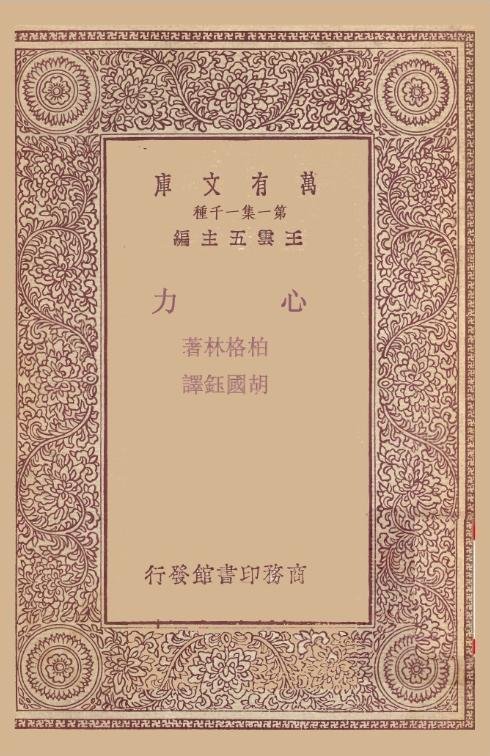本书所以名为“心力”者,其意以为意识像一条大河流一样,挟一种强大的力,极力冲向前去,不限于固定的地位,而后始能继续“创化”。所以这本书的主脑,仍然只是“创化”一件事。本书共有七篇文章。第一篇的主要意思,在说明意识的两种功用:记忆既往和预期将来。这两种功用即“创化”之必要条件。这篇的结论仍然说人生之目的在“创化”。其中关于“绵延”、“自由意志”、“物质”、“记忆”及“直觉”等,也都有所讨论。这篇文章可以说是伯格森哲学的精华。与伯格森哲学最相反的,莫过于近世最流行的“脑心平行说”,所以他对于这学说也就努力攻击。第七篇采取“显过破”的方法,第二篇采取“立量破”的方法。第二篇的结论有两方面:一方面证明“精神活动”远超过于“脑髓活动”之外,这也就是第三篇的主旨;一方面证明脑髓只是注意生命的一个机关,这也就是第四第五两篇的主旨。第六篇又是回护第一篇的论点,专在证明意识之预期作用。总之,“心力”之说若能成立,则“创化”之理即可确鉴无疑。