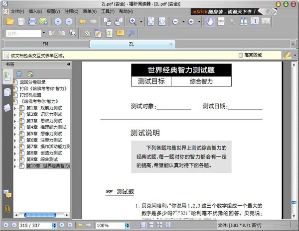 : 第一章 观察力测试 第二章 记忆力测试 第三章 思维力测试 第四章 推理能力测试 第五章 想象力测试 第六章 注意力测试 第七章 操作能力测试 第八章 创造力测试 第九章 综合测试 第十章 世界经典智力题