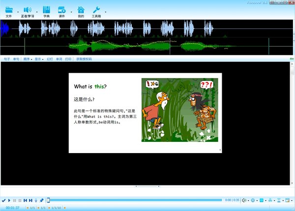 1. 学外语 :视频、音频文件都可以做为外语学习材料。 2. 练口语 :独创的” VOTE “( 视觉口语训练引擎 )提供每个音节的原声/跟读波形和音调比对,迅速定位和纠正口语问题。 3. 练听力 :以波形图为主导,选取复读区间,进行局部有重点复读。 4. 做课件 :借助 课件编辑器 ,制作课件像写WORD文档一样简单,创造真正自由的学习资源。 5. 听写 :实时纠错,实时校对,全文批改总结。 6. 造句 :弹指之间,牢牢掌握句子,支持全鼠标或全键盘操作。 7. 字典 :内置英英、英汉、图片、例句、常用搭配等高品质字典,支持听音查字。 8. 变速 :全程支持音视频文件、录音、英英字典中例句朗读、单词发音等变速不变调。 9. 断句 :自动将音视频文件分割成多个句子,精确、便捷,省去手工断句的麻烦。 10. 更多 :难重点句库、分级生词本、造句练习、单词发音训练等多种辅助工具。 11. 外延 :非常方便地导出资料到手持设备。