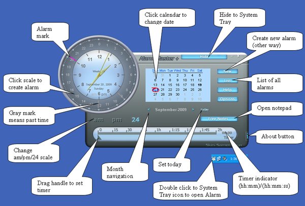This multifunctional personal organizer includes alarm clock, scheduler, timer and calendar. The program supports skins. Alarm Master Plus is the same as Alarm Master but it additional supports a lot of media formats (WAV, MP3, MPG, AVI and many other), text to speech function and astrological zodiac calendar.