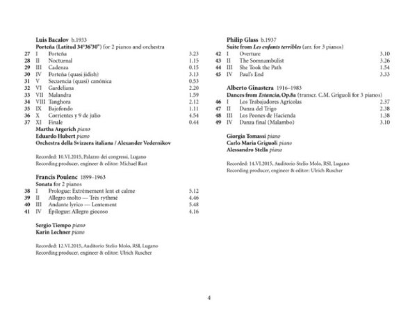 The only orchestral piece is Luis Bacalav’s work featuring two pianos, Porteña (Latitud 36°36’30”). The title refers to a female from Buenos Aires, presumably Argerich. She and Eduardo Hubert play its many moods expressively and enthusiastically. Bacalav is a composer of film music, and this piece is tuneful and showy. Many will love it for its soulfulness and energy, like Gershwin with a Latin twist. Perhaps we could give Rhapsody in Blue a rest.