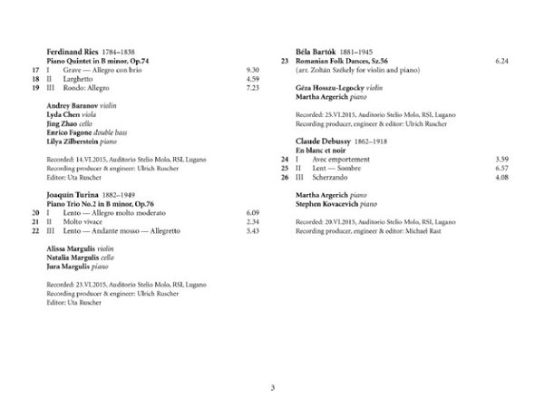 Other chamber works are Joaquin Turina’s Piano Trio No. 2, whose fervent impressionism is sustained by the Margulis family trio. Argerich and violinist Géza Hosszu-Legocky play Bartok’s irresistible Romanian Folk Dances with aplomb.