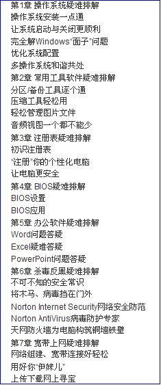 电脑入门与提高疑难排解大全描述 用电脑哪有不出问题的,我们日常操作中遇到的电脑故障,绝大多数都是一些比较容易排除的小毛病,诸如系统配置不当、软件操作错误、网络使用故障之类。只是由于对电脑故障的不熟悉,很多人都不敢去尝试自己排除这些看似玄妙无比的故障。本手册主要针对电脑用户在使用电脑的过程中经常遇到的各种疑难问题,从实用、便捷的角度出发,讲述具体的应对方法及处理技巧。内容主要包括操作系统疑难排解、常用工具软件疑难排解、注册表疑难排解、BIos疑难排解、文字办公疑难排解、病毒与安全防范疑难排解、网络应用疑难排解等七个部分,集实用性、资料性、手册性于一体特,别适合电脑初学者阅读和珍藏。