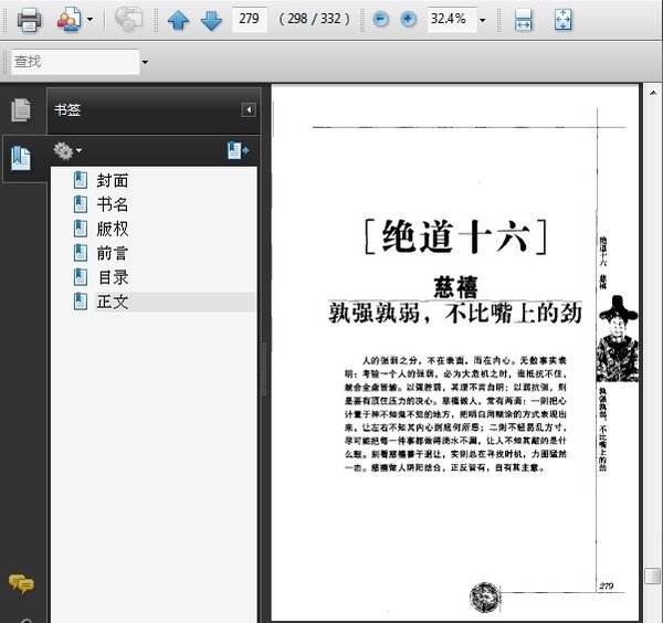 : 绝道一 秦始皇:在关键时刻,明白自己该做什么 1、牢记大志,忍受着熬过难关 2、想做强者,必先做得低下头 3、学会韬光养晦,慢慢琢磨下一步 4、按照自己的想法去做事 绝道二 刘邦:聪明人是让人看不出聪明 1、笑是豁达最好的表现 2、万不可把自己逼上绝路 3、能屈能伸,干什么都无所谓 4、多听人言,会让自己变得更聪明 5、慷慨与智对是杀手锏 绝道三 曹操:多面脸,多面手 绝道四 刘备:只要用脑,人生并无太复杂的事 绝道五 杨坚:正确地把握自己最重要 绝道六 李世民:本领强大,全靠平时磨练 绝道七 武则天:摸准“弹性法则”的奥妙 绝道八 赵匡胤:人与人之间是棋手关系 绝道九 成吉思汗:把目标引向大处 绝道十 忽必烈:认认真真抓好几件事 绝道十一 朱元璋:得势之道在于实力 绝道十二 努尔哈赤:抓住机遇,人生就能闪光 绝道十三 康熙:绝不让周围“节外生枝” 绝道十四 雍正:用犀利之眼洞察一切是非 绝道十五 乾隆:要想心安稳,必须做踏实 绝道十六 慈禧:孰强孰弱,不比嘴上的劲