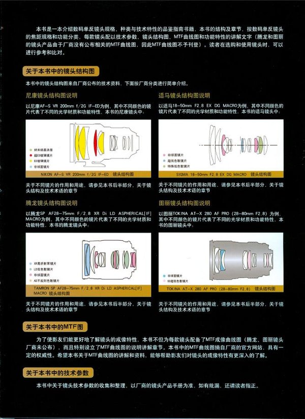 本书是一本介绍数码单反镜头规格、种类与技术特性的品鉴指南书籍,本书的结构及章节,按数码单反镜头的焦距和功能分类,每款镜头配以技术参数、镜头结构图、MTF曲线图和功能特性的讲解文字。读者在选购和使用镜头时,可以进行参考和比对。