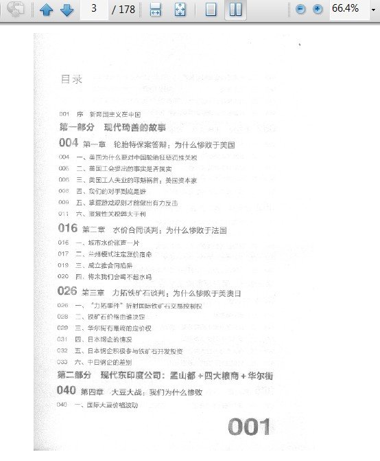 : 序 新帝国主义在中国 第一部分 现代琦善的故事 第一章 轮胎特保案答辩:为什么惨败于美国 一、美国为什么要对中国轮胎征惩罚性关税 二、美国工会提出的事实是否属实 三、美国工人失业的罪魁祸首:美国资本家 四、我们的对手到底是谁 五、掌握游戏规则才能做出有力反击 六、报复性关税弊大于利 第二章 水价合同谈判:为什么惨败于法国 一、城市水价涨声一片 二、兰州模式注定涨价宿命 三、威立雅合同陷阱 四、将来我们会喝不起水吗 第三章 力拓铁矿石谈判:为什么惨败于美澳日 一、“力拓事件”折射国际铁矿石交易控制权 二、铁矿石价格由谁决定 三、华尔街有最终的定价权 四、日本钢企的情况 五、日本钢企积极参与铁矿石开发投资 六、中日钢企的差别 第二部分 现代东印度公司:盂山都+四大粮商+华尔街 第四章 大豆大战:我们为什么惨败 一、国际大豆价格波动 二、中国压榨企业纷纷破产 三、四大粮商 四、四大粮商都控制了什么 五、炒蛋的油将由华尔街来定价 第五章 玉米大战:难逃惨败的厄运 一、中国也对美国产品反倾销? 二、玉米与石油挂钩 三、如果中国开放玉米进口 四、即使中国不开放玉米进口 五、孟山都的玉米中到底藏着什么 第六章 棉花大战:毒手已开始操纵 一、中国的棉花市场已经被全面操纵了 二、孟山都的转基因棉花产品 三、登海公司的遭遇和孟山都的做法 四、面对美国政府的棉花高补贴率,中国怎么办 五、中国农业怎么办:其他农牧产品也难逃毒手 第三部分 揭开新帝国主义的“画皮” 第七章 从汇源谈起:外资收购中国企业的真面目 一、避开德隆系 二、这只是外资大规模收购的尾声 三、惊人的外资企业覆盖率 四、有人想过外资大量收购的后果吗 五、如何应对外资的大规模收购 六、警惕不公平收购 第八章 从沃尔玛谈起:外资整合中国产业链的真面目 一、沃尔玛的思维高度 二、沃尔玛室什么来整合产业链 三、沃尔玛军团为什么能压缩成本 四、沃尔玛这条贪吃蛇的七寸在哪里 五、沃尔玛与万达:四年间从牛气冲天到被抛弃 六、成也物流,败也物流:为什么传统优势让沃尔玛在中国头痛不已 七、青出于蓝? 八、沃尔玛的出路 第四部分 新帝国主义的真面目 第九章 看现代欧美帝国主义如何掠夺非洲:索马里海盗的真正原因 一、与世无争的古国:索马里 二、索马里灾难的开始 三、从渔民到海盗:他们为何铤而走险 四、他们没有明天 第十章 看现代欧美帝国主义如何掠夺非洲:外媒批评中国非洲战略的真正原因之一 一、独立,并不意味着摆脱帝国主义 二、第一个圈套:比较优势 三、第二个圈套:私有化 四、军事行动为经济利益服务 五、里应外合,他们将非洲洗劫一空 第十一章 看现代欧美帝国主义如何掠夺非洲:外媒批评中国非洲战略的真正原因之二 一、西方视角看中非关系 二、中国威胁欧洲在非利益? 三、中国对非政策遭遇妖魔化 四、中国破坏了西方的利益格局 第五部分 美国到底在干什么 第十二章 要了解美国,就要先了解奥巴马:我们应该怎么看他 一、传奇的黑人总统 二、奥巴马的标志:改变 三、奥巴马旋风对中国意味着什么 四、奥巴马班底中的精英们 五、奥巴马能否力挽狂澜 第十三章 欧洲人怎么看他:诺贝尔和平奖,怎么就是奥巴马? 一、核心原则:感动挪威的“年度”国际人物 二、勃兰特:跪一次,得个奖 三、戈尔:拍个电影,得个奖 四、基本标准:北欧价值观的代言人 五、此“和平”非彼“和平” 第十四章 奥巴马如何对付中国:解读奥巴马访华的三个礼物 一、上海引进迪士尼是个荒谬计划 二、第一个礼物:汇率大战 三、第二个礼物:贸易大战 四、第三个礼物:成本大战 五、美国的国家战略绝不会因为迪士尼而改变 六、美国人的逻辑思维平台 七、美国人对付中国动用了创造思维 八、中国经济的潜在困境 九、面对危机,不同选择不同结果 十、中国会陷入长期经济停滞吗 十一、中国会陷入通货膨胀吗 十二、落井下石:美国将如何算计中国经济