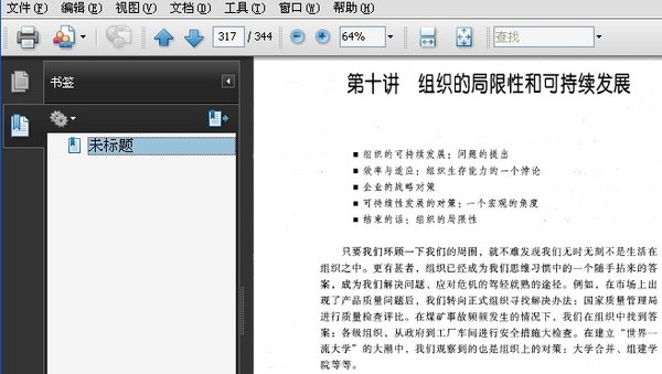 : 第一讲 导论:组织现象和组织社会学 第二讲 组织与市场:一个交易成本经济学的研究角度 第三讲 组织与制度:一个制度学派的理论框架 第四讲 组织与社会关系网络 第五讲 有限理性与组织研究 第六讲 组织中的激励问题 第七讲 契约制度研究 第八讲 声誉制度的比较研究 第九讲 有限理性与组织决策 第十讲 组织的局限性和可持续发展