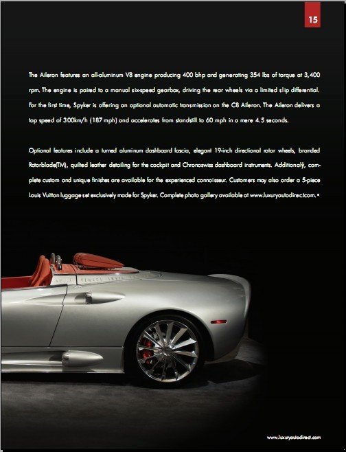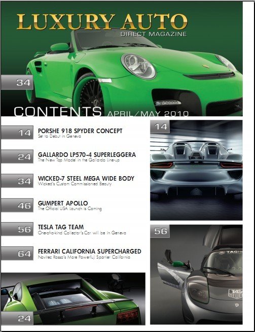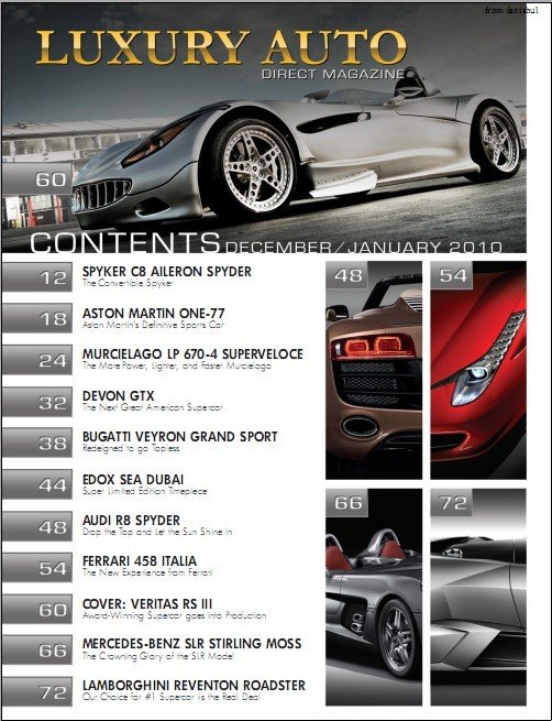 美国地区介绍豪华跑车的双月刊 介绍关于跑车的一切资讯 例如外观 动力配置 车内装潢等等 像Ferrari Lamborghini Porsche BUGATTI Maserati 等等品牌的奢华跑车 也都是此杂志介绍的对象 虽然我们买不起这些顶级的豪华跑车 但还是可以通过图片饱饱眼福 解解馋