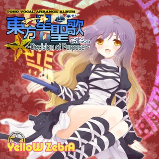 いえろ~ぜぶら例大祭7新作、東方アレンジアルバム第11弾!! 『東方星聖歌 ~Decision of Purpose~』のご紹介です。 お待たせ致しました、夏コミ(C76)ぶりの新作の登場です!! 一回お休みの分を埋めるべく、新作の「東方星蓮船」からのアレンジや 既存の人気曲の再アレンジ、そして要望の多くありましたデュエット曲等を 混ぜ合わせたフル充電完了の「いえろ~ぜぶら」最新作です。 今回も看板ボーカル「藤宮ゆき&うっち-」のお二人に歌って頂きました。 デュエット曲も勿論有り有りで、お二人の歌声を存分にお楽しみ頂けると思います。 歌声は、幻想郷を翔けて行く・・・