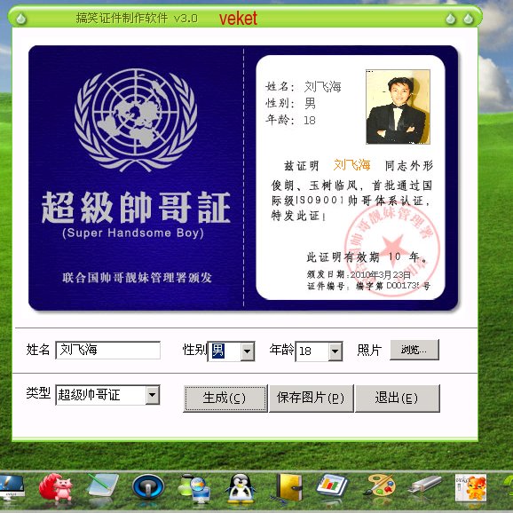 搞笑证件制作软件,能制作灌水证,超级帅哥证,超级美眉证,光棍证,浆糊证,忽悠证,色狼证,网恋许可证,良家妇女证,良好市民证,银河系A证等.超级搞笑,值得一试.