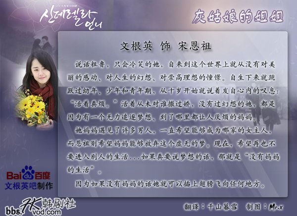 【剧情简介 】:讲述了充满仇恨的灰姑娘向继母和姐姐们报仇的故事。文根英在这部《灰姑娘的姐姐》中将饰演欺负灰姑娘的姐姐角色,这是文根英出道至今首次诠释反面角色。剧中瑞雨饰演和姐姐文根英生活在同一屋檐下的具孝贤,她承受姐姐的各种虐待,父亲去世后还要承受继母的折磨。但是剧情发展到中期,瑞雨有了明显的破格变身,她变成想报复姐姐文根英的角色。