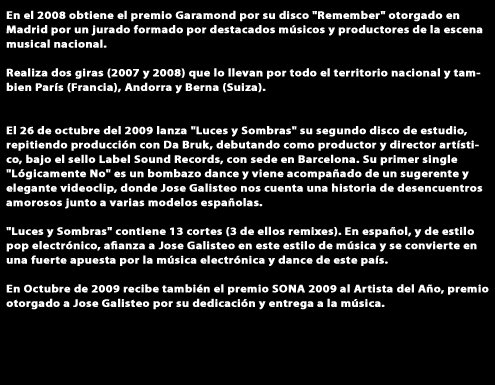 百分百强烈推荐!!西班牙偶像又一新秀实力派帅哥José Galisteo全新热舞专辑Luces y Sombras火热出炉!   José Galisteo(全名:JOSÉ ANTONIO GALISTEO GARCÍA)是西班牙歌唱比赛Operación Triunfo(相当于西班牙偶像)第五季选手,在比赛中成绩位居第6。其后发行了处女大碟《Remember》,专辑中的I Promised Myself更是西班牙乃至欧洲的大热单曲。其后在西班牙,法国和瑞士等地进行了几次巡演。   Luces y Sombras是他去年发行的第二张专辑,专辑风格主打Dance-pop/electronic-pop,曲风动感明快,一气呵成。有让你听着忍不住起舞的首单Lógicamente no(绝不...)和参选代表西班牙参加2010年欧洲歌唱大赛的Beautiful life(专辑唯一的英文歌,那首Stop是西语的);还有同名歌曲Luces Y Sombras——刚开始听的时候觉得这首歌不是很特别,但听多了有点上瘾的感觉,慢板清新小调Déjame(让我...)则是José在表现其感性浪漫的一面;而带有一点R&B和Hip-pop风格Stop也是值得强烈推荐极具特色的歌曲。