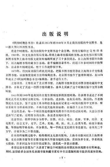 《民国时期总书目》由北京图书馆编,书目文献出版社1986年-1997年陆续出版。它以北京图书馆、上海图书馆、重庆图书馆的馆藏为基础编撰,收录了1911年至1949年9月间中国出版的中文图书124000余种,基本反映了民国时期出版的图书全貌。