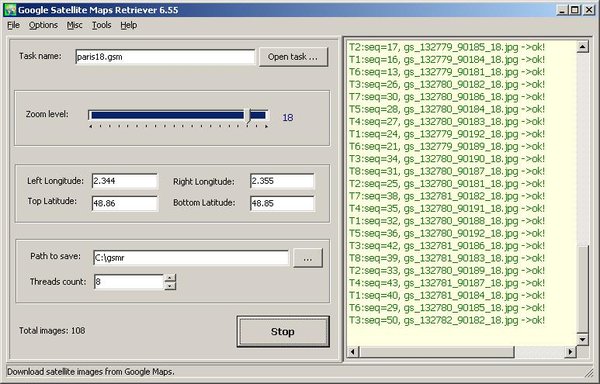 Google Satellite Maps Retriever is a tool that help you to get small tile satellite images from google maps. All downloaded small images are saved on the disk. You can view downloaded maps by Maps Viewer Or you can combine them into a big BMP map by Maps Combiner.