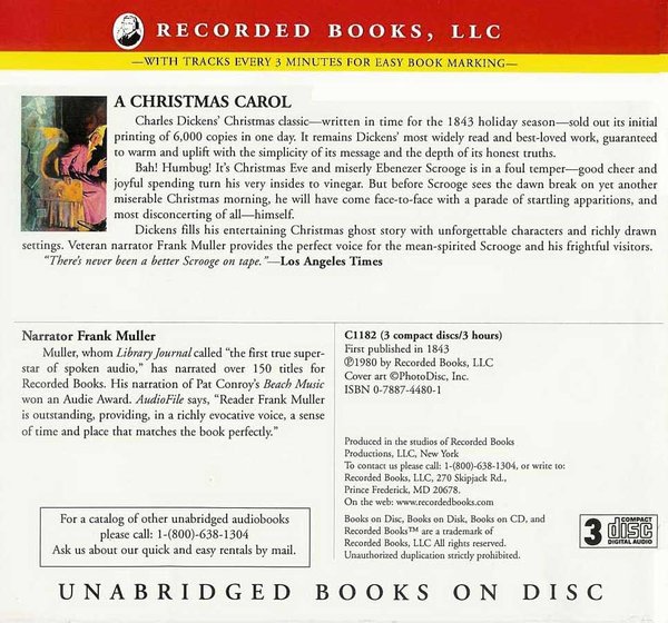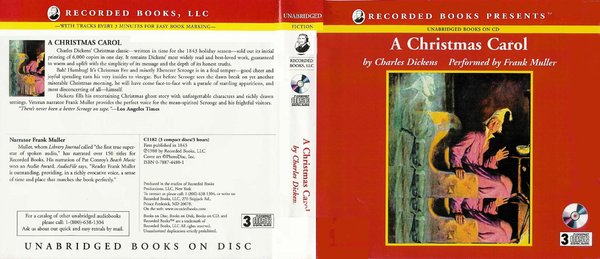 A CHRISTMAS CAROL by Charles Dickens (1843) Read by Frank Muller Publisher : Recorded Books (1980) ISBN : ISBN-10: 0788744801; ISBN-13: 9780788744808 Format : MP3. From 3 CD's (3 hours). Tracks about every 3 minutes. 51 tracks. Bitrate : ~90 kbps (iTunes 8, VBR, mono, 44kHz) Unabridged: Always (Frank Muller never read an abridgement) PDF copy included (ESL and reference friendly).