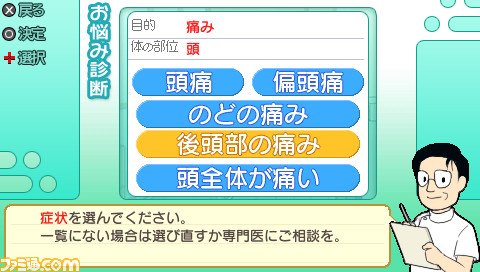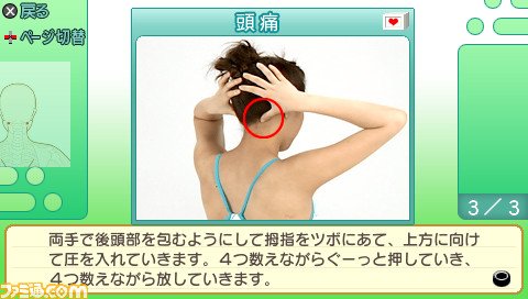 日本游戏开发商DORASU制作、发行。预定2010年春季在PSP掌机平台上推出指导实用型软件:《大众按摩:痛苦疲惫也爽快》(Minna no Shiatsu: Itami mo Tsukare mo Sukirii)。目前本作的官方网站已正式开通,并且放出了游戏最新画面与信息,供各位玩家参考。 按摩与推拿以中西医基础理论为指导,以各种手法技巧或器械为作用力,直接作用于人体表面的特殊部位,产生生物物理和生物化学的变化,最终通过神经系统调节,体液循环调节,以及筋络穴位的传递效应,达到舒筋活骨,消除疲劳、防治疾病,从而提高和改善人体生理机能的各种操作手法。 而PSP实用软件《大众按摩:痛苦疲惫也爽快》(Minna no Shiatsu: Itami mo Tsukare mo Sukirii)正是DORASU推出的一款按摩指导查询实用软件。该系列还曾于2007年8月30日在NDS掌机上推出过一款名为:《全家一起来:日本指压师会监修轻松指压指南》(Kazoku Minna de Nippon Shiatsu Shikai Kanshuu: RakuRaku Shiatsu Navi)相关软件。 PSP实用软件《大众按摩:痛苦疲惫也爽快》包含了“日本指压师协会”规定的主要内容,充分帮助使用者理解和掌握按摩的各种分类和技法,包括:“保健按摩”、“ 运动按摩”、“ 医疗按摩”和“ 减肥按摩”等,而按摩的主要技法双包括:“推法”、“擦法”、“揉法”、“ 揉捏法”和“搓法”等等。相信对于想了解按摩相关知识的人群还是很有帮助的。 游戏画面: