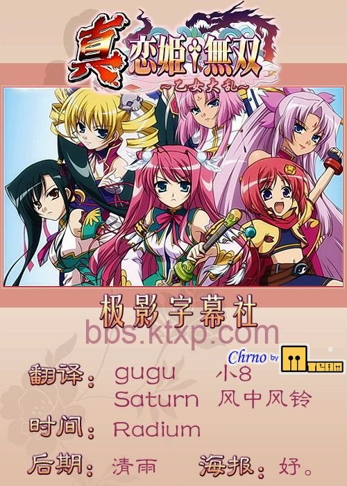【内容介绍】 「恋 姬†无双」是根据BaseSon社于2007年1月在PC平台推出的幻想冒险游戏「恋姬†无双~心跳☆满是少女的三国演义~」改编的TV动画,因史上的著 名三国武将在作品中都被设定为美少女登场而引起各方话题。而今年10月她将会以「真・恋姬†无双」之名再度驾临电视荧幕,该作改编自2008年12月推出 的PC游戏「真・恋姬†无双~乙女缭乱☆三国志演义~」,并由前作的原班人马携手打造。新作将会以游戏版的新增角色刘备为主角展开故事 【STAFF】 原作:BaseSon(「真・恋姬†无双~乙女缭乱☆三国志演义~」) 监督:中西伸彰 系列构成・脚本:杂破业 总人物设 定・总作画监督:大岛美和 人物设定・总作画监督:平冢知哉 动画制作:动画工房 【CAST】 刘备:后藤麻衣 关 羽:黑河奈美 张飞:西泽广香 诸葛亮:鸣海エリカ 赵云:本井えみ 马超:小林真纪 黄忠:雨宫侑布 【官方网站】 http://www.mmv.co.jp/special/shinkoihime/