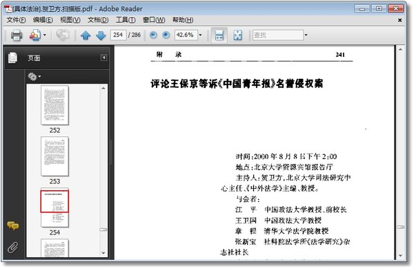 : 法治民主 二十世纪中国法治回眸 法治与法律家之治 ——访法学院贺卫方教授 法学家的缺席 法治 人治 运动治 投票箱的妙用 学习民主 ——对泰兴市“3·11”事件的思考 民主建设的重要一步 律师的政治参与 修宪与宪法实效 关于乡土社会的法律与秩序 法律不可亵玩 法学:自治与开放 司法改革 司法改革:四组矛盾,八项课题 中国司法传统的再解释 用程序意识重铸司法灵魂 民事审理制度中的审级与管辖 ——林荣耀教授“两岸民事审理制度的比较研究”读后 评王利明《司法改革研究》 关于主审法官制 法学教授进法院 困或一题 附:也谈“困惑”(愚冠) 无效率乃司法公正之大敌 证人出庭 重新定位检察权 ——答《中国律师报》记者王岚问 被告席上的传媒 司法对新闻自由的保护 司法与传媒 简评“焦占访谈” 事案评论 不智的诉讼 含糊的判决 二审判决缺乏说理 王英为什么败诉 附:王英为什么不该败诉(汪庆华) 一桩热门事件 三点理性建言 附:答网友问题与评论 点评刘燕文诉北京大学案 转了向的里程碑 不可思议的判决 职员的生命也是国家利益——评姚丽事件 ——答《中国青年报》记者问 名誉权的界限 ——《中国青年报》记者 肖英 极端难题 叫我如何不恐惧 三六九等说教授 从程序的角度看“长江读书奖”风波 序文一束 李著《沈家本传》序 徐著《批评与思考》序 人文理性之闪光 ——以问答体为唐文著《法官判案如何讲理》写的代序 《北大法律评论》寄语 附录 刘秋海事件的法律透视 评论王保京等诉《中国青年报》名誉侵权案