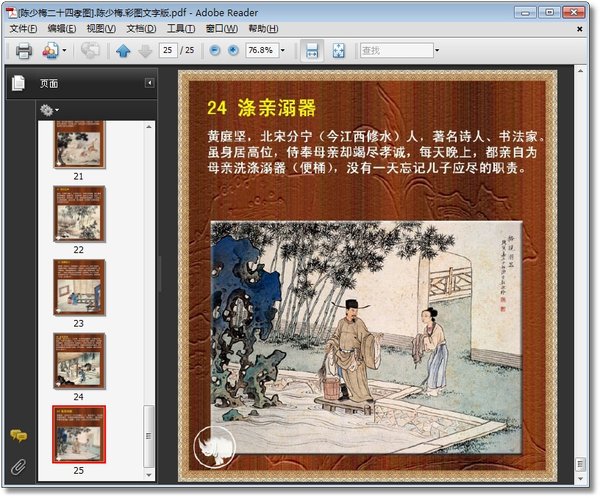 : 001.孝感动天 002.亲尝汤药 003.啮指痛心 004.百里负米 005.芦衣顺母 006.鹿乳奉亲 007. 戏彩娱亲 008.卖身葬父 009.刻木事亲 010.行佣供母 011.怀橘遗亲 012.为母埋儿 013. 扇枕温衾 014.拾葚异器 015.涌泉跃鲤 016.闻雷泣墓 017.乳姑不怠 018.卧冰求求鲤 019. 恣蚊饱血 020.扼虎救父 021.哭竹生笋 022.尝粪忧心 023.弃官寻母 024.涤亲溺器