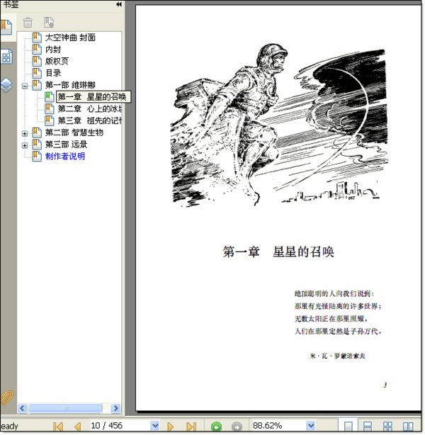 罗曼·拉托夫纪念像建立的时候,他还活着,但不在人世间。一张大理石座椅,一条大理石围带,系住一尊大理石的飞行员。飞行员仿佛正从无法返航的远方,忧戚而深沉地眺望着。   高大的大理石像矗立在大路上,它分开迎面驶来潮水般的车流,仿佛想要阻遏住急行的人群,告诉他们:如今世界上还没有一种力量,可以使人类摆脱大自然的束缚,挣出大地的怀抱,自由来往于广漠无垠的宇宙间……罗曼·拉托夫带领了一个考察组飞往火星。行程中,航船控制系统的一部喷气式推进器出了故障。因而航船就再也不能返回地球了。可是,全体乘员还能生活很长一段时间——制造人工食品的设备可以运转许多年。在这段时间里,宇航员们一方面深知自己必遭灭亡的结局, 一方面继续向星球飞航, 至于抵达这些星球则是这一辈子办不到的事了……   罗曼·拉托夫考察组竭尽一切可能保持与地球上的联系。由于离地球越来越远,航船上远程电波发射器发出的信号逐渐衰减,甚至高灵敏度的射电望远镜也越来越难以觉察到了。   拉托夫发回的最后一份电讯的收录人员中,有他的儿子阿尔谢尼。阿尔谢尼为了当自己渴念的信号出现时能够在场,一直没有离开无线电天文台。   这次,射电望远镜收录到航船信号已经到了灵敏极限。 《太空神曲》二校图文版,版面还原 全书由Ken777进行OCR、校对、排版制作。 2008年03月30日一校 2008年05月18日二校