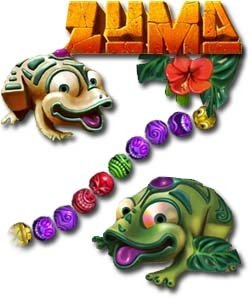 这是一款老少皆宜的益智类游戏,主角是一只石青蛙,它会吐出各种颜色的小球。小球造型美丽并且有着神秘的色彩,环绕着石青蛙的是载着小球的轨道,各种颜色的小球会沿着轨道 向前滑动。石青蛙阻止小球滚进轨道终点的洞里的方法就是用吐出小球与轨道上的小球相结合,颜色相同且数量达到三个以上就会消除得分。屏幕右上方有一个分数格。当达到一定分数(黄色的气满)的时候游戏中会听到 “ZUMA”的声音,然后所有小球倒退若干步。这是一个表面现象,这个分数格最重要的作用是表示该版的结束,当“ZUMA”叫出后,就不会再增加小球了,也就是说消除完眼前的所有小球就能过关了。