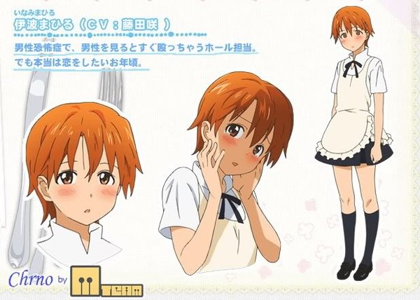 因为父亲错误的教育方式而得到了男性恐惧症(包括雄性动物)。接待女性顾客相当完美,但会痛殴男性顾客。由于父亲的阴谋而腕力强大,经常破坏墙壁和电线杆。就读女子高中,不擅长男性教师教导的古文和数学。