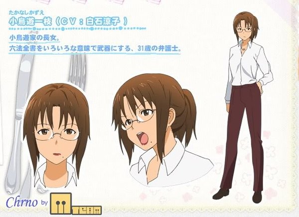 小鸟游家长女。31岁。小鸟游家中身高最高,戴眼镜的律师。离过婚。于第25话登场。