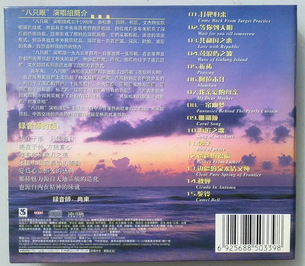 “八只眼”演唱组成立于1990年,由松鹿、杨庆、国际、文杰四位歌唱演员组成。其前身是中央乐团男声四重唱组。四位成员多年来积累了深厚的艺术功底,逐渐形成了独特的演唱风格。它们采取轻松、活泼的演出形式,包容并收集中外民歌精品,演绎出一首首丰满、深沉、欢愉、浪漫的名曲,散发出极强的艺术魅力