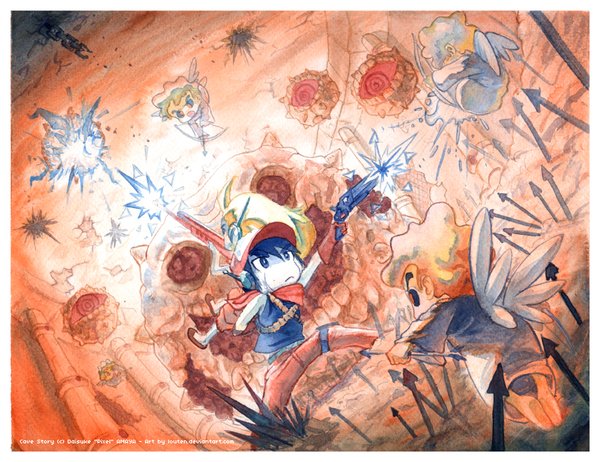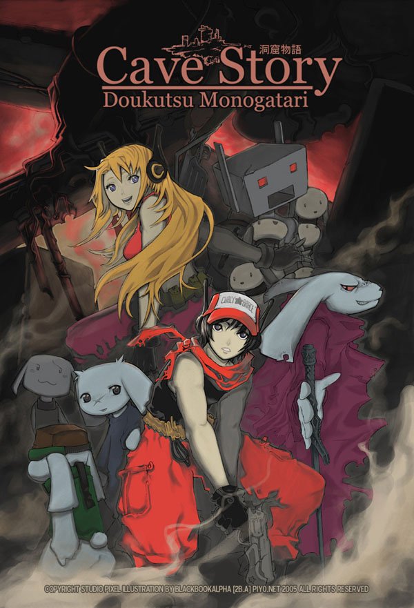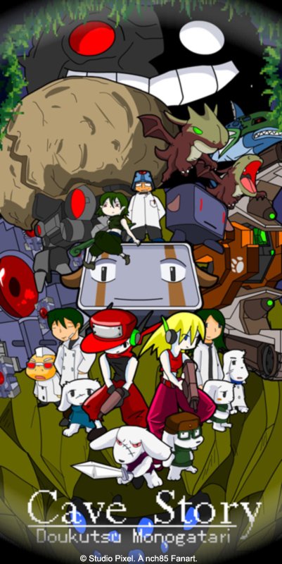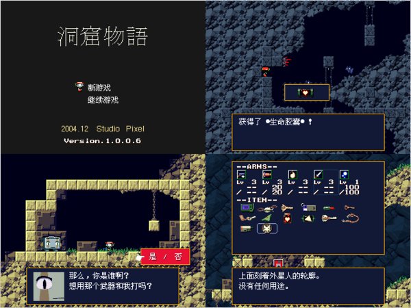 洞窟物语 (洞窟物语,Doukutsu Monogatari) 是由 Pixel 历时 5 年独立开发的 2D 横卷轴动作游戏(类似银河战士,恶魔城,洛克人)。虽说是免费的独立游戏,但却有着超越许多商业游戏的高质量:良好的操作手感,流畅的游戏流程,个性鲜明的角色设计,引人入胜的剧情,令人回味的合成器音乐,复古而精致的像素风格画面。