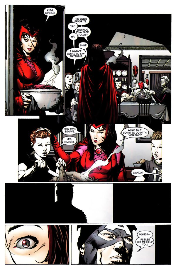 正当所有人都不明白怎么回事的时候,Marvel世界的大魔法师Dr.Stanger降临了,他感到魔法发生了异常。他问诸人:“你们知道有谁拥有可以改变现实的魔法么?”资深队员们露出了难以置信的神色,是的,有一个人可以做到这种事----Scarlet Witch,万磁王的女儿Wanda!