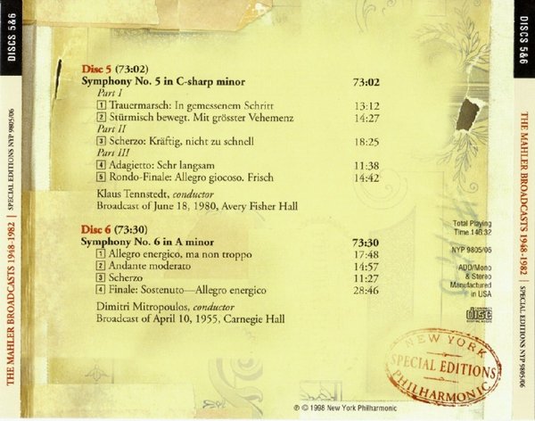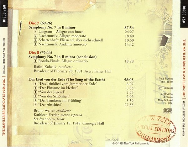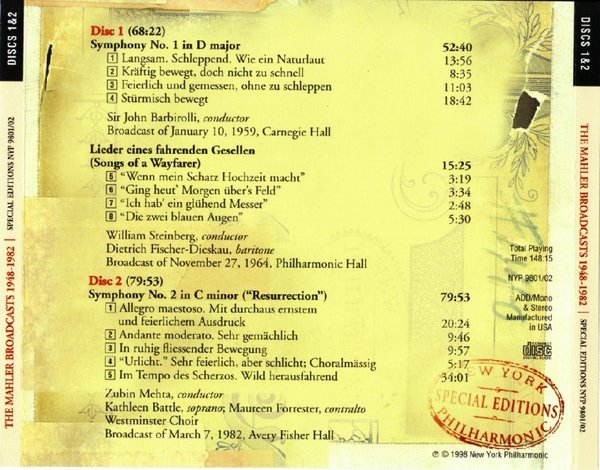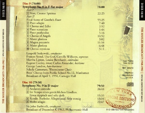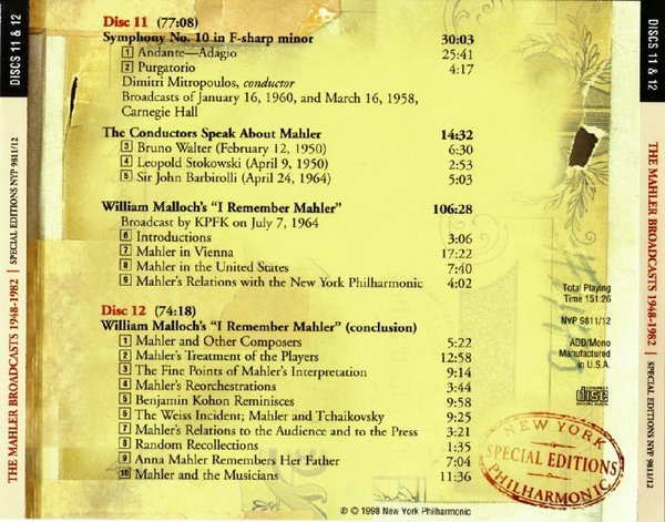 : CD1 01 Symphony No.1 - 1.Langsam, Schleppend 02 Symphony No.1 - 2.Kräftig bewegt, doch nicht zu schnell 03 Symphony No.1 - 3.Feierlich und gemessen, ohne zu schleppen 04 Symphony No.1 - 4.Stürmisch bewegt- Energisch 05 Lieder eines fahrenden Geschllen - 1.Wenn mein Schatz Hochzeit macht 06 Lieder eines fahrenden Geschllen - 2.Ging heut morgen übers Feld 07 Lieder eines fahrenden Geschllen - 3.Ich hab'ein glühend Messer 08 Lieder eines fahrenden Geschllen - 4.Die zwei blauen Augen CD2 01 Symphony No.2 - 1.Allegro maestoso 02 Symphony No.2 - 2.Andante moderato 03 Symphony No.2 - 3.In ruhig fliessender Bewegung 04 Symphony No.2 - 4.Urlicht 05 Symphony No.2 - 5.Im Tempo des Scherzos CD3 01 Symphony No.3 - 1.Kräftig entschieden 02 Symphony No.3 - 2.Tempo di Menuetto 03 Symphony No.3 - 3.Comodo (Scherzando) 04 Symphony No.3 - 4.Sehr langsam--Misterioso 05 Symphony No.3 - 5.Lustig im Tempo und keck im Ausdruck CD4 01 Symphony No.3 - 6.Langsam--Ruhevoll--Empfunden 02 Symphony No.4 - 1.Bedächtig, nicht eilen 03 Symphony No.4 - 2.In gemächlicher Bewegung, ohne Hast 04 Symphony No.4 - 3.Ruhevoll 05 Symphony No.4 - 4.Sehr behaglich CD5 01 Symphony No.5 - 1.Trauermarsch 02 Symphony No.5 - 2.Stürmisch bewegt 03 Symphony No.5 - 3.Scherzo 04 Symphony No.5 - 4.Adagietto 05 Symphony No.5 - 5.Rondo-Finale CD6 01 Symphony No.6 - 1.Allegro energico,ma non troppo 02 Symphony No.6 - 2.Andante moderato 03 Symphony No.6 - 3.Scherzo 04 Symphony No.6 - 4.Finale- Sostenuto-Allegro energico CD7 01 Symphony No.7 - 1.Langsam-Allegro con fuoco 02 Symphony No.7 - 2.Nachtmusik- Allegro moderato 03 Symphony No.7 - 3.Schattenhaft 04 Symphony No.7 - 4.Nachtmusik- Andante amoroso CD8 01 Symphony No.7 - 5.Rondo-Finale- allegro ordinario 02 Das Lied von der Erde - 1.Das Trinklied vom Jammer der Erde 03 Das Lied von der Erde - 2.Der Einsame im Herbst 04 Das Lied von der Erde - 3.Von der Jugend 05 Das Lied von der Erde - 4.Von der Schönheit 06 Das Lied von der Erde - 5.Der Trunkene im Frühling 07 Das Lied von der Erde - 6.Der Abschied CD9 01 Symphony No.8 part 1 Veni, Creator Spiritus 02 Symphony No.8 part 2 - 1.Poco adagio 03 Symphony No.8 part 2 - 2.Chorus and Echo 04 Symphony No.8 part 2 - 3.Pater ecstaticus 05 Symphony No.8 part 2 - 4.Pater profundus 06 Symphony No.8 part 2 - 5.Chorus of Angels 07 Symphony No.8 part 2 - 6.Mater gloriosa 08 Symphony No.8 part 2 - 7.Magna peccatrix 09 Symphony No.8 part 2 - 8.Mater gloriosa 10 Symphony No.8 part 2 - 9.Chorus mysticus CD10 01 Symphony No.9 - 1.Andante comodo 02 Symphony No.9 - 2.Im Tempo eines gemächlichen Ländlers 03 Symphony No.9 - 3.Rondo-Burleske 04 Symphony No.9 - 4.Adagio CD11 01 Symphony No.10 - 1.Andante-Adagio 02 Symphony No.10 - 2.Purgatorio 03 The Conductors Speak about Mahler - Bruno Walter 04 The Conductors Speak about Mahler - Leopold Stokowski 05 The Conductors Speak about Mahler - Sir John Barbirolli 06 William Malloch's 'I Remember Mahler' Broadcast - Introductions 07 William Malloch's 'I Remember Mahler' Broadcast - Mahler in Vienna 08 William Malloch's 'I Remember Mahler' Broadcast - Mahler in the US 09 William Malloch's 'I Remember Mahler' Broadcast - Mahler's relations with NYPO CD12 01 Mahler and other composers 02 Treatment of the players 03 Fine Points of Mahler interpretation 04 Mahler's reorchestrations 05 Benjamin Kohon Reminisces 06 Weiss Incident; Mahler and Tchaikovsky 07 Mahler's relations to the public and Press 08 Random Recollections 09 Anna Mahler remembers her Father 10 Mahler and the musicians