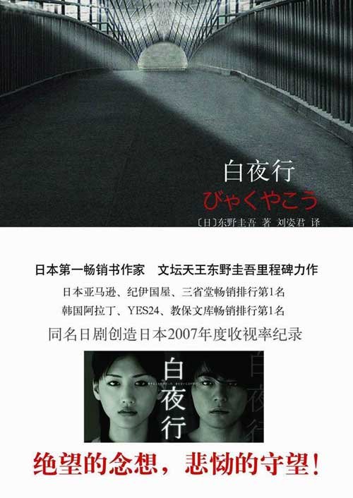 :   东野圭吾,日本著名作家。1958年生于大阪。1985年,以第31届江户川乱步奖获奖作品《放学后》出道,开始扬名立万。20年作品逾60部,几乎囊括日本所有大奖:1999年,《秘密》获第52届日本推理作家协会奖,入围第120届直木奖;2000年,《白夜行》入围第122届直木奖;2001年,《暗恋》入围第125届直木奖;2004年,《幻夜》入围第131届直木奖;2006年的《嫌疑人X的献身》,获得第134届直木奖、第6届本格推理小说大奖。   《白夜行》出版之后引起巨大轰动,使东野圭吾成为天王级作家。小说被改编成同名电视连续剧,与图书一同为作家带来了如潮好评,使他成为日本、韩国与中国台湾等地最受欢迎的作家之一。“只希望能手牵手在太阳下散步”,这个象征本书故事内核的绝望念想,有如一个美丽的幌子,随着无数凌乱、压抑、悲凉的事件片段如纪录片一样一一还原,最后一丝温情也被完全抛弃,万千读者在一曲救赎罪恶的爱情之中悲切动容……